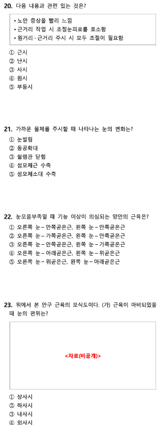 21. 가까운 물체를 주시할 때 나타나는 눈의 변화는?