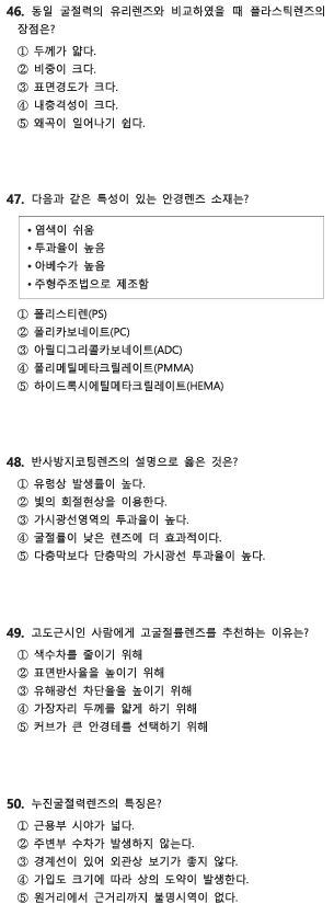 47. 다음과 같은 특성이 있는 안경렌즈 소재는?