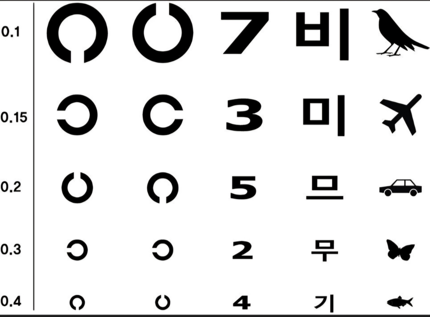 정상 시력: 일반적으로 1.0(또는 20/20)으로 표현됩니다. 이는 20피트 거리에서 표준 사람이 식별할 수 있는 글자를 볼 수 있음을 의미합니다.
