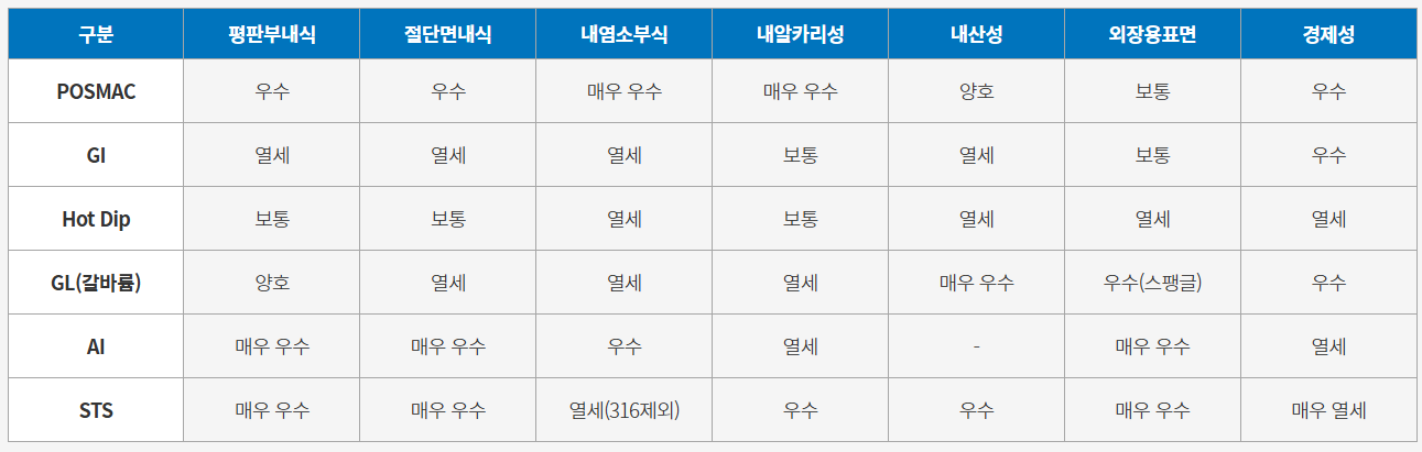- 우수한 내식성: 아연, 마그네슘, 알루미늄의 합금 도금으로 부식에 강하며, 절단면에서도 내식성을 유지합니다.